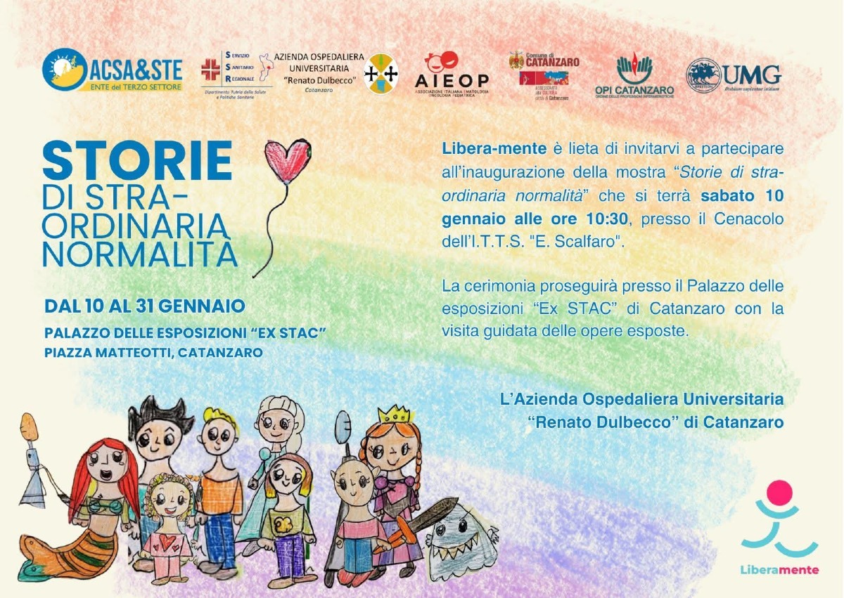 “Storie di stra-ordinaria normalità” è una mostra artistica che colleziona e dona ai visitatori Storie di vita di bambini, adolescenti, giovani adulti e famiglie afferenti al reparto di Ematoncologia Pediatrica dell’Azienda Ospedaliera Universitaria “Renato Dulbecco”.