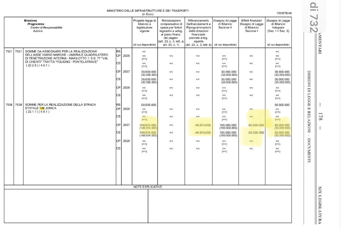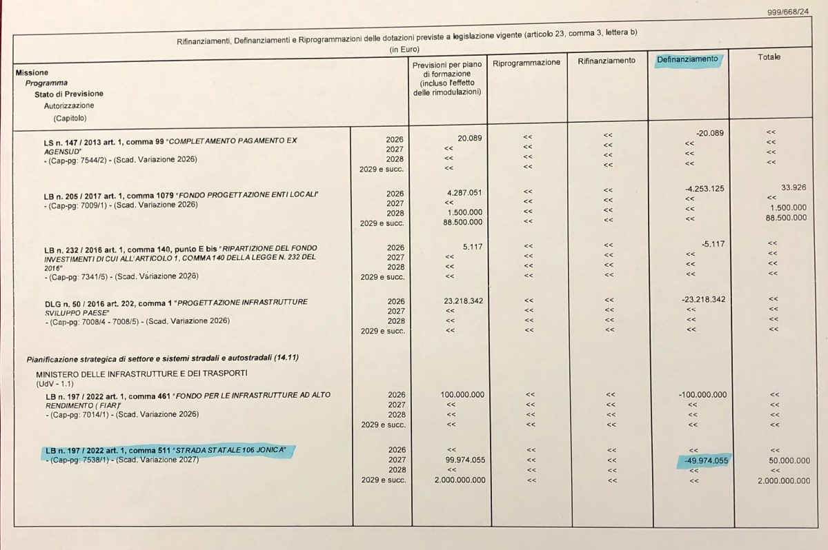 Riceviamo e pubblichiamo - A giudicare dalle dichiarazioni del centrodestra sulla Statale 106, qualcuno dovrebbe ricordare che l’italiano non è un’opinione: manovra parla di definanziamento. Mettendo a fuoco il punto: nel 2027 nel bilancio dello Stato per la statale 106 erano previsti circa 150 milioni di euro. Quello che il centrodestra chiama “rimodulazione” le tabelle ad integrazione della nuova legge di bilancio chiamano in realtà “definanziamento” per circa 50 milioni di euro.