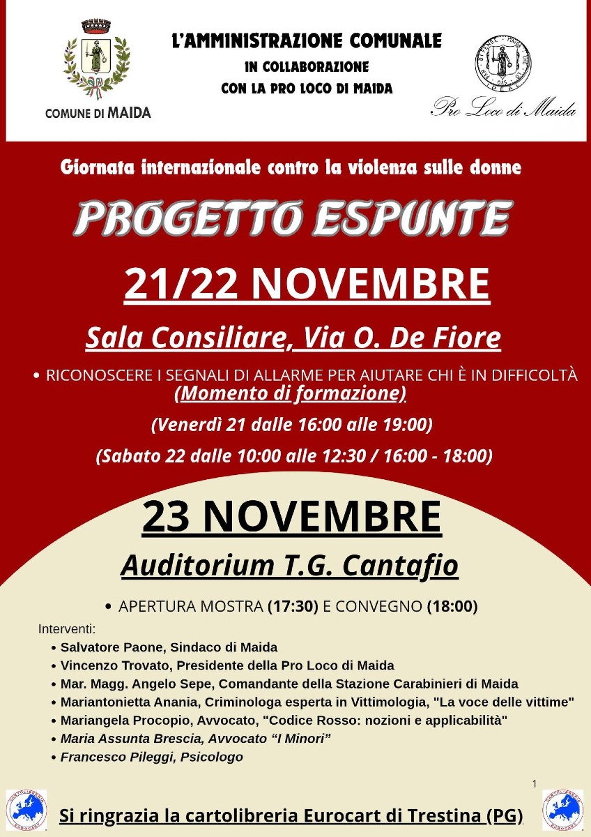 Maida - In occasione della Giornata internazionale contro la violenza sulle donne, l’Amministrazione comunale di Maida, in collaborazione con la Pro Loco, annuncia l’avvio del “Progetto Espunte”, curato da Mariantonietta Anania.