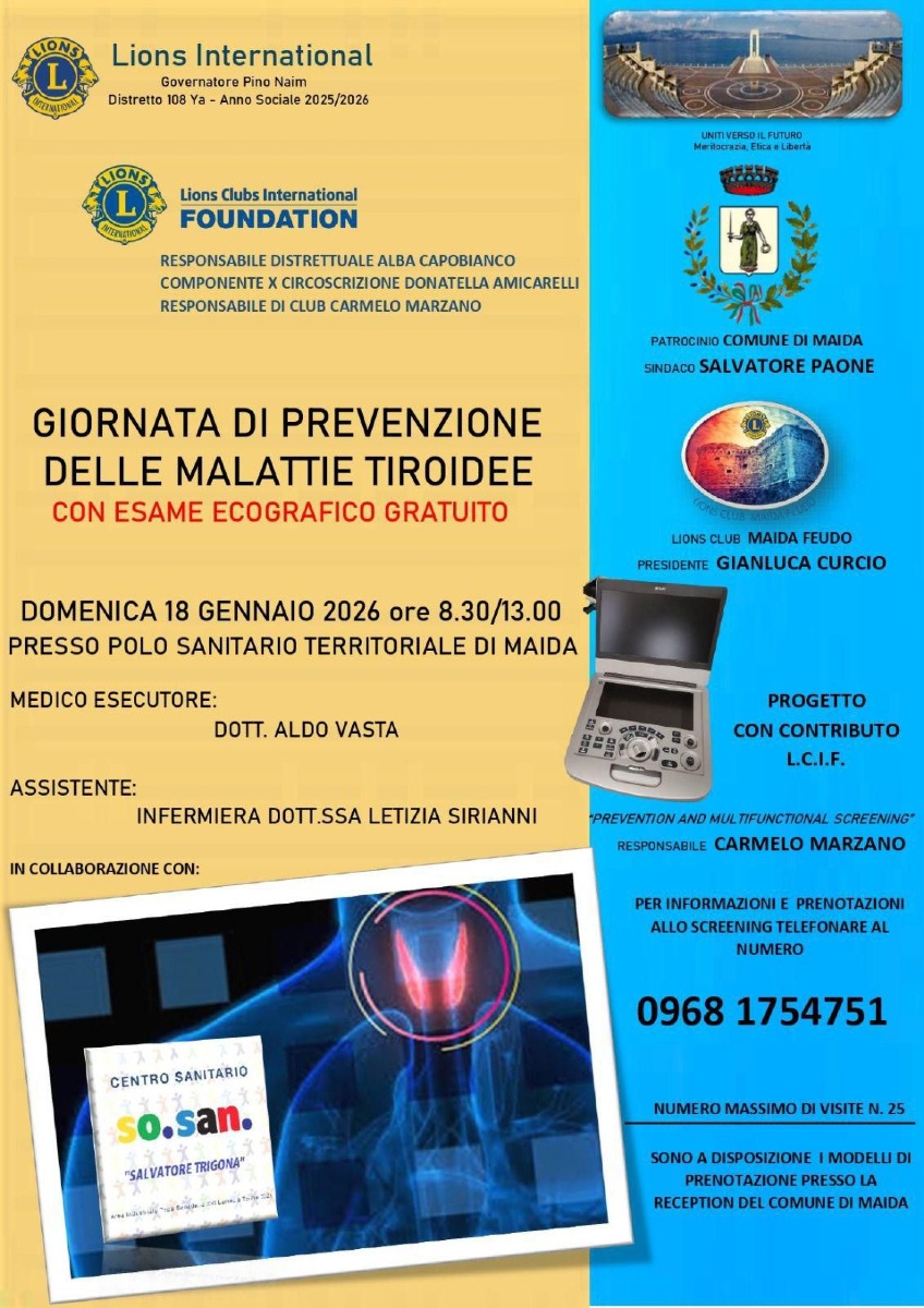 Maida - Il Comune di Maida annuncia il patrocinio e la promozione della Giornata di Prevenzione delle Malattie Tiroidee, iniziativa organizzata dal Lions Club Maida Feudo in collaborazione con Lions International e Lions Clubs International Foundation. L’appuntamento è fissato per domenica 18 gennaio 2026, dalle 8:30 alle 13:00, presso il Polo Sanitario Territoriale di Maida.
