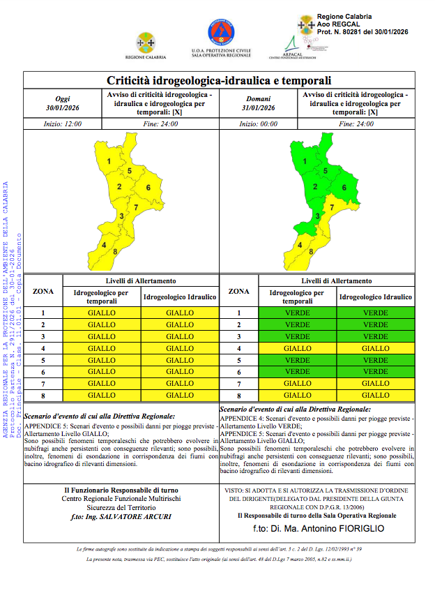L'avviso è valido per la giornata di oggi 30 gennaio 2026 fino alle ore 24.00